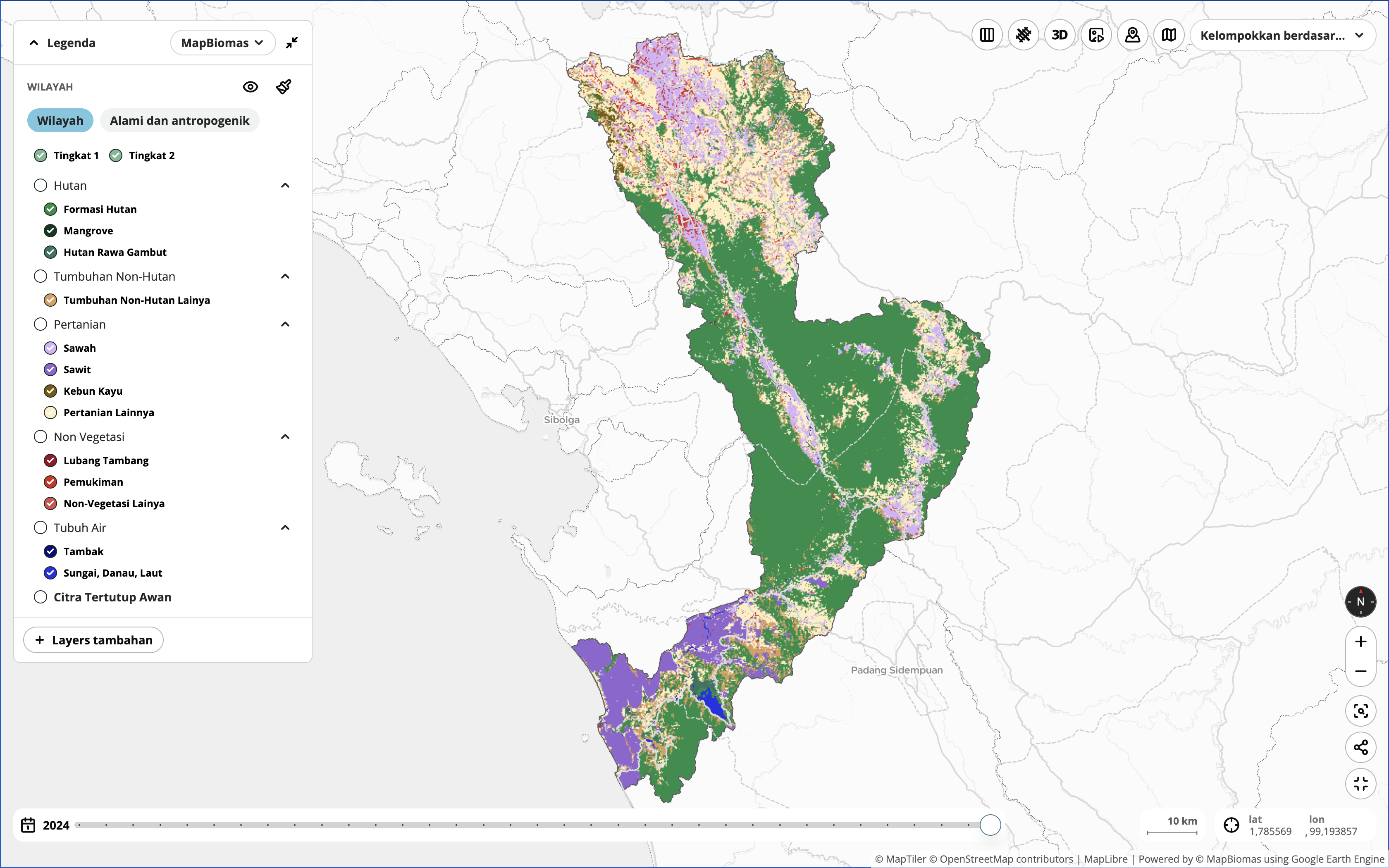Kondisi tutupan lahan di Daerah Aliran Sungai (DAS) Batang Toru 2024. Sumber: Mapbiomas Indonesia.