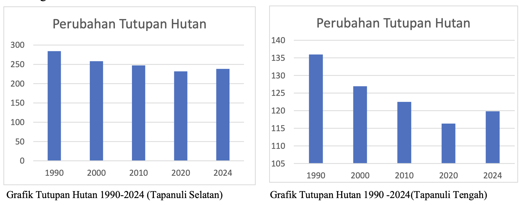 Kondisi serupa juga tampak di Tapanuli Tengah. Sejak 1990 hingga 2024, wilayah ini kehilangan sekitar 16.137 hektare hutan alam. Kehilangan terbesar terjadi pada periode 1990–2000, yakni 9.023 ha, disusul periode 2010–2020 sebesar 6.154 ha. Pola ini menunjukkan kerusakan hutan yang berlangsung bertahap namun konsisten dalam tiga dekade terakhir.