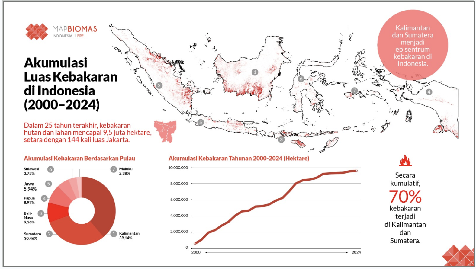 Sepanjang 2000-2024, total lahan yang pernah mengalami kebakaran di Indonesia seluas 9,5 juta ha. Kalimantan menjadi wilayah dengan luasan terbakar terbesar 3,7 juta ha (39,1 persen), disusul Sumatera seluas 2,9 juta ha (30,5 persen), Bali–Nusa Tenggara 892.034 ha (9,4 persen), Papua 855.024 ha (9 persen), Jawa 566.615 ha (5,9 persen), Sulawesi 357.691 ha (3,8 persen), dan Maluku 227.115 ha (2,4 persen).