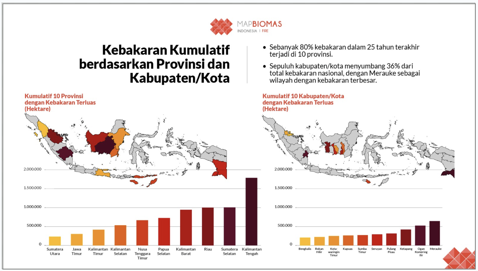 Total wilayah yang terbakar mencapai luas 9,5 juta ha, sekitar 4 juta ha teridentifikasi sebagai area yang berulang kali terbakar.