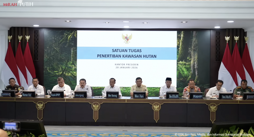 Tangkapan layar konferensi pers pencabutan 28 izin di Sumatra oleh Mensesneg Hadi Prasetyo. Sumber: Youtube