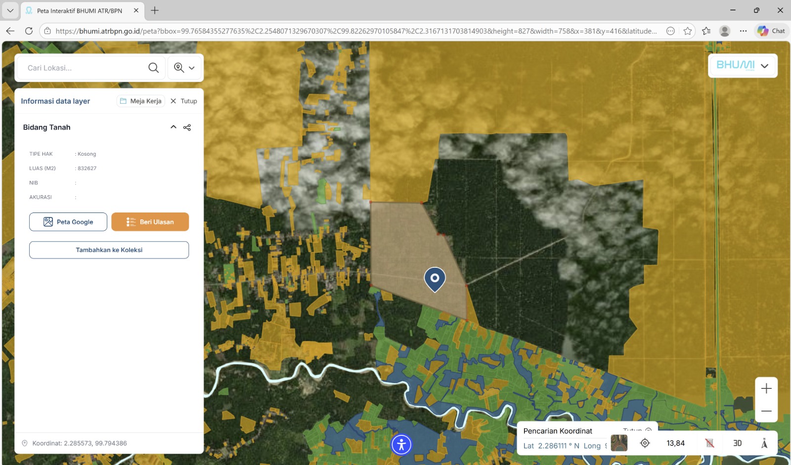 Status/tipe hak: kosong di atas 83 hektar lahan yang dikuasai petani KTPHS di Kampung Baru, Desa Padang Halaban,Kecamatan Aek Kuo, Labuhan Batu Utara. Sumber: bhumi.atrbpn.go.id
