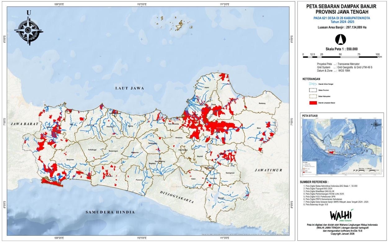 Peta sebaran dampak banjir Provinsi Jateng Tahun 2024-2025. Sumber: Walhi Jateng.