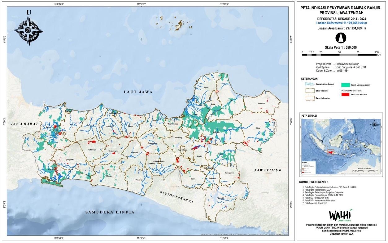 Peta indikasi penyebab dampak banjir di Provinsi Jateng oleh deforestasi dekade 2014-2024. Sumber: Walhi Jateng.